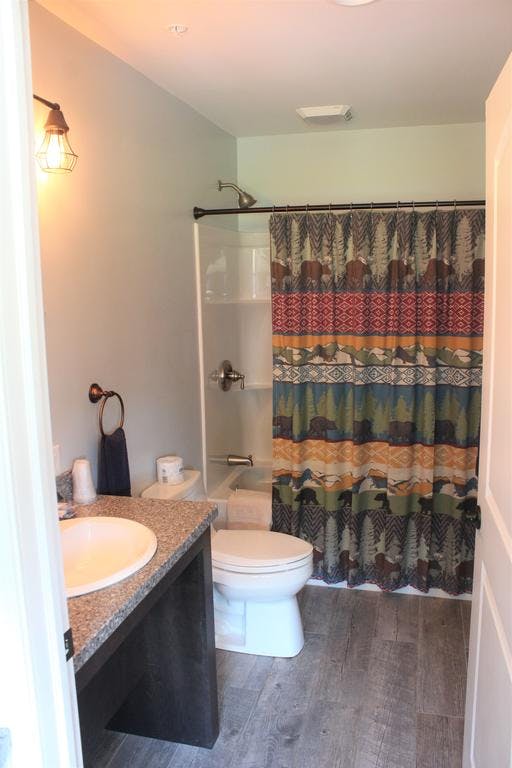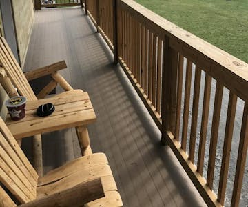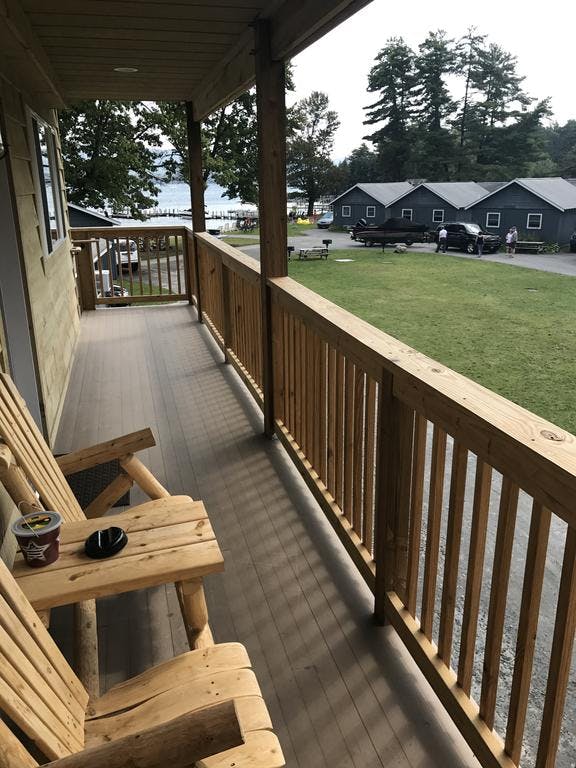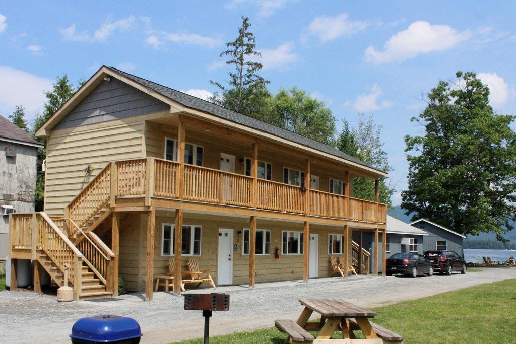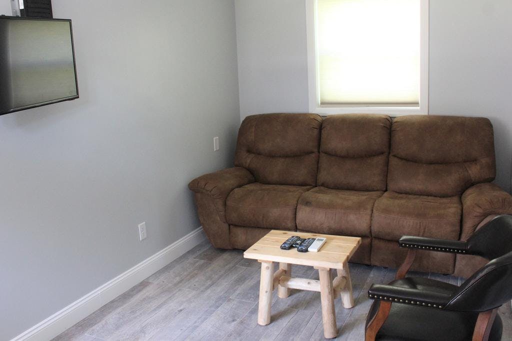 Newly constructed one-bedroom suite. Separate sleeping area with a queen and a double bed. Living area with couch, Cable TV, table and chairs, refrigerator, microwave, and coffee maker. Staircase access. Lake Views. A short walk on our flat and level property to the beach and swim area.